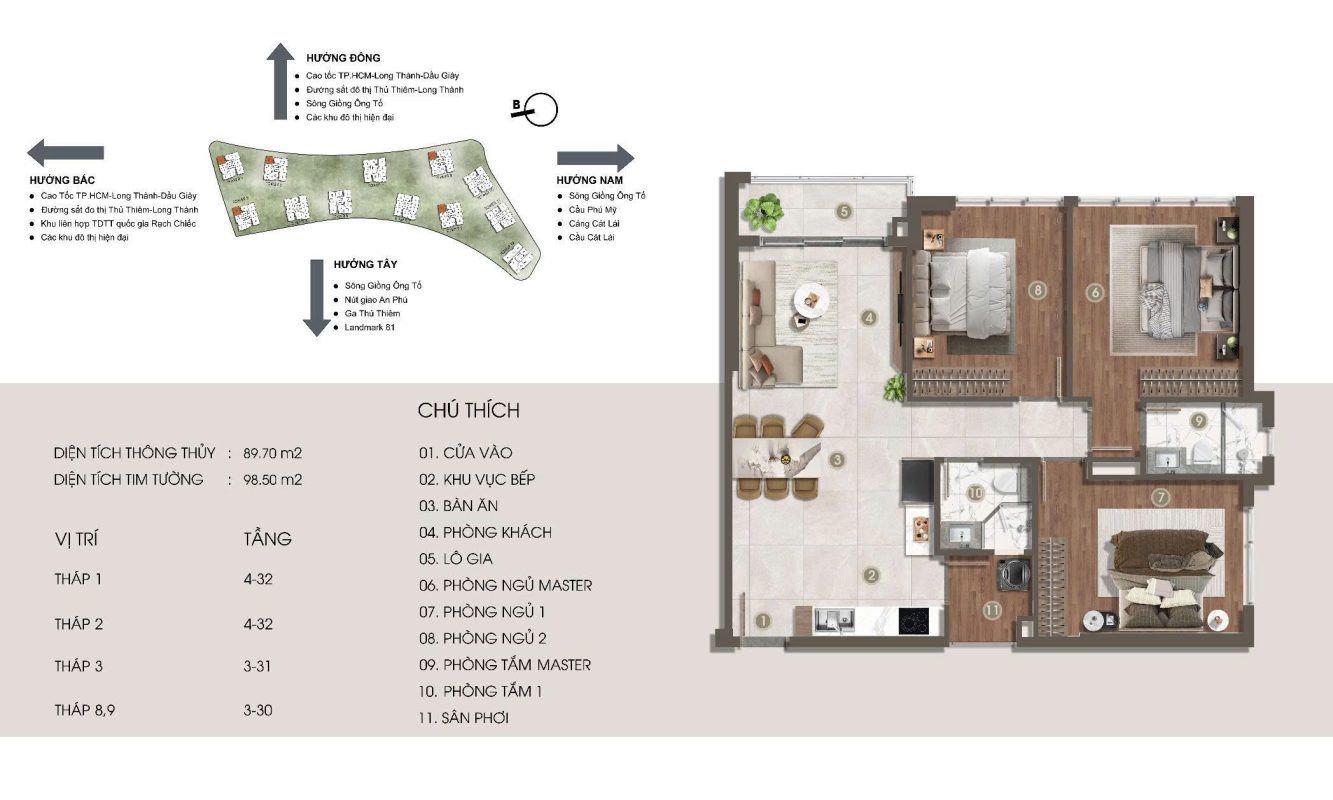 Mỗi căn hộ đều được thiết kế vuông vức, với các phòng chức năng được phân chia hợp lý để tối ưu hóa không gian sống. Các căn hộ có ban công rộng rãi, giúp tận dụng tối đa không gian ngoài trời và mang đến tầm nhìn đẹp mắt hướng ra sông hoặc các khu vực xung quanh. Các phòng ngủ đều có cửa sổ lớn, mang đến ánh sáng tự nhiên và làn gió mát cho không gian sống.