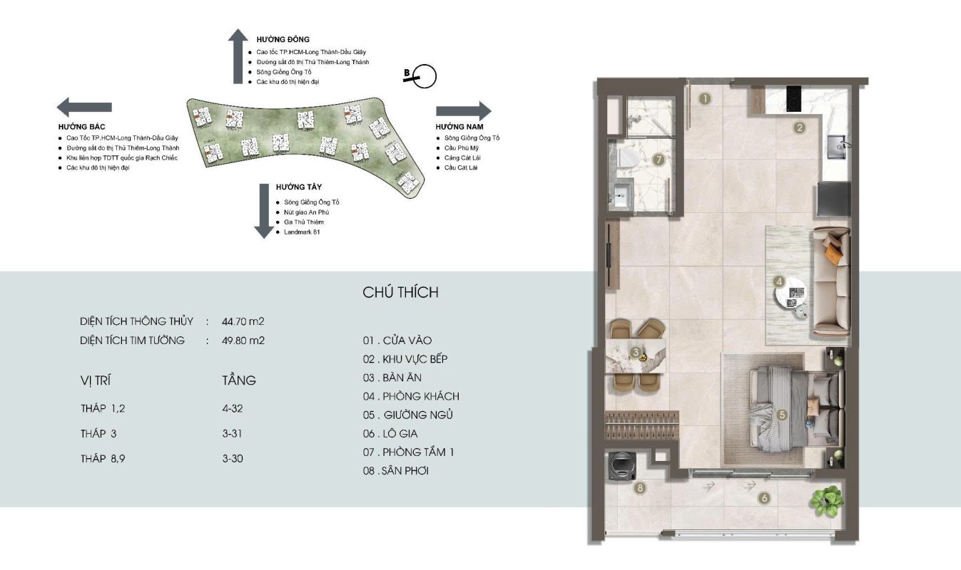 Căn hộ 1 phòng ngủ/studio: 49.14m² Căn hộ 2 phòng ngủ: 71 – 76 – 79.98 – 80.76 – 81.17 – 85.06m² Căn hộ 3 phòng ngủ: 95.01 – 94.93m² Penthouse/duplex (2 tầng): 107.78 – 118.96 – 132.66 – 143.39 – 146.17 – 151.19m² |