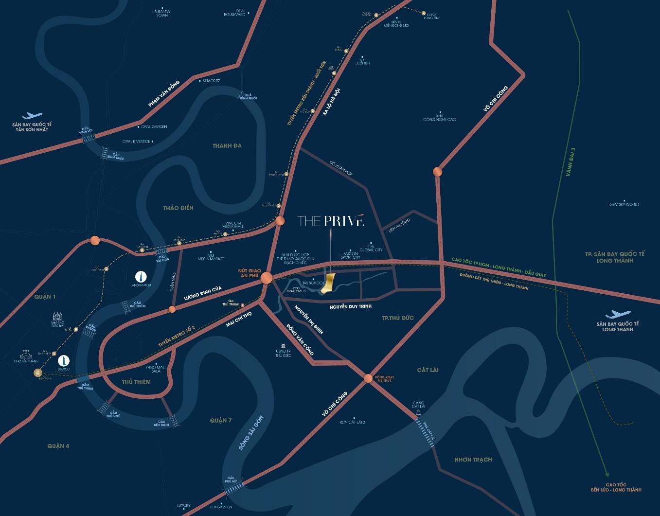 The Privé tọa lạc tại mặt tiền đường Song Hành cao tốc TP.HCM – Long Thành – Dầu Giây, thuộc khu dân cư Nam Rạch Chiếc, phường An Phú, TP. Thủ Đức (trước đây là Quận 2). Đây là tọa độ cực kỳ đắt giá khi nằm gần các tuyến giao thông huyết mạch như nút giao An Phú, đường Mai Chí Thọ, đường Lương Định Của, Cao tốc, giúp cư dân dễ dàng kết nối đến trung tâm Quận 1, khu đô thị Thủ Thiêm, sân bay Long Thành.